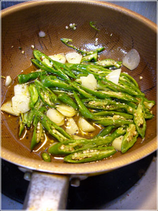 たっぷりの青とうがらしににんにくをオリーブオイルで…