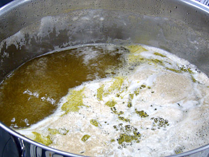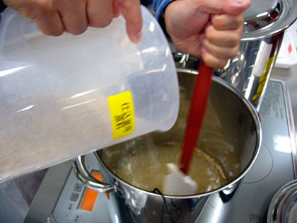 お湯が沸いたら麦芽を入れて
