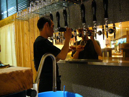 ビールを注ぐ副店長Tさん